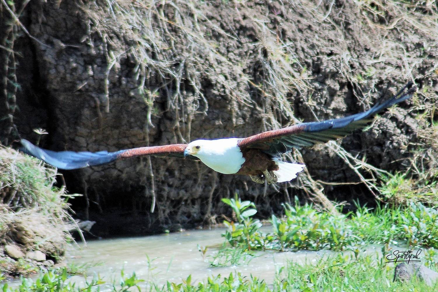 African Fish Eagle swooping over a tributary of the Ewaso Nyiro in Ol Pejeta conservancy in Northern Kenya.